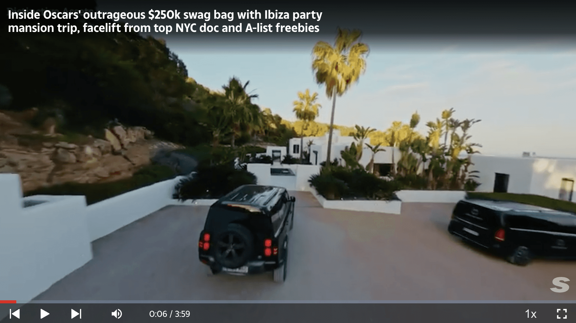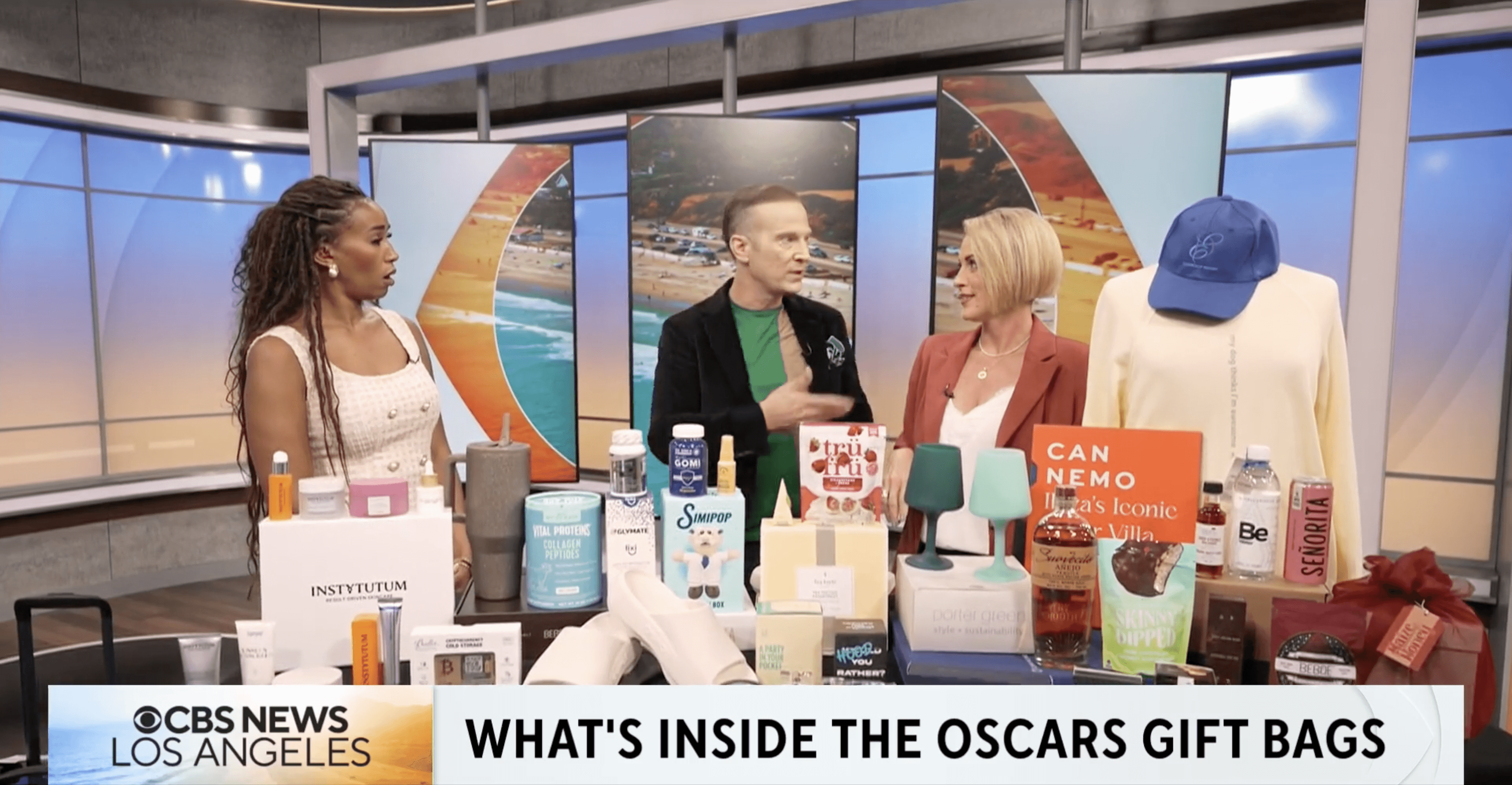 A television segment discussing the famous Oscar nominee gift bags highlights some of the luxury items included. The video references the Ibiza villa Can Nemo as one of the travel experiences connected to the bag.